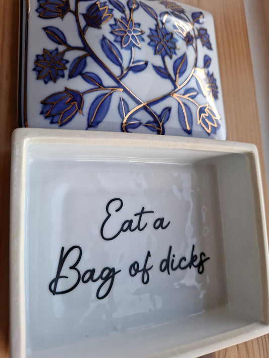 'Eat A Bag Of Dicks' Large Upcycled Blue/White Ceramic Pot