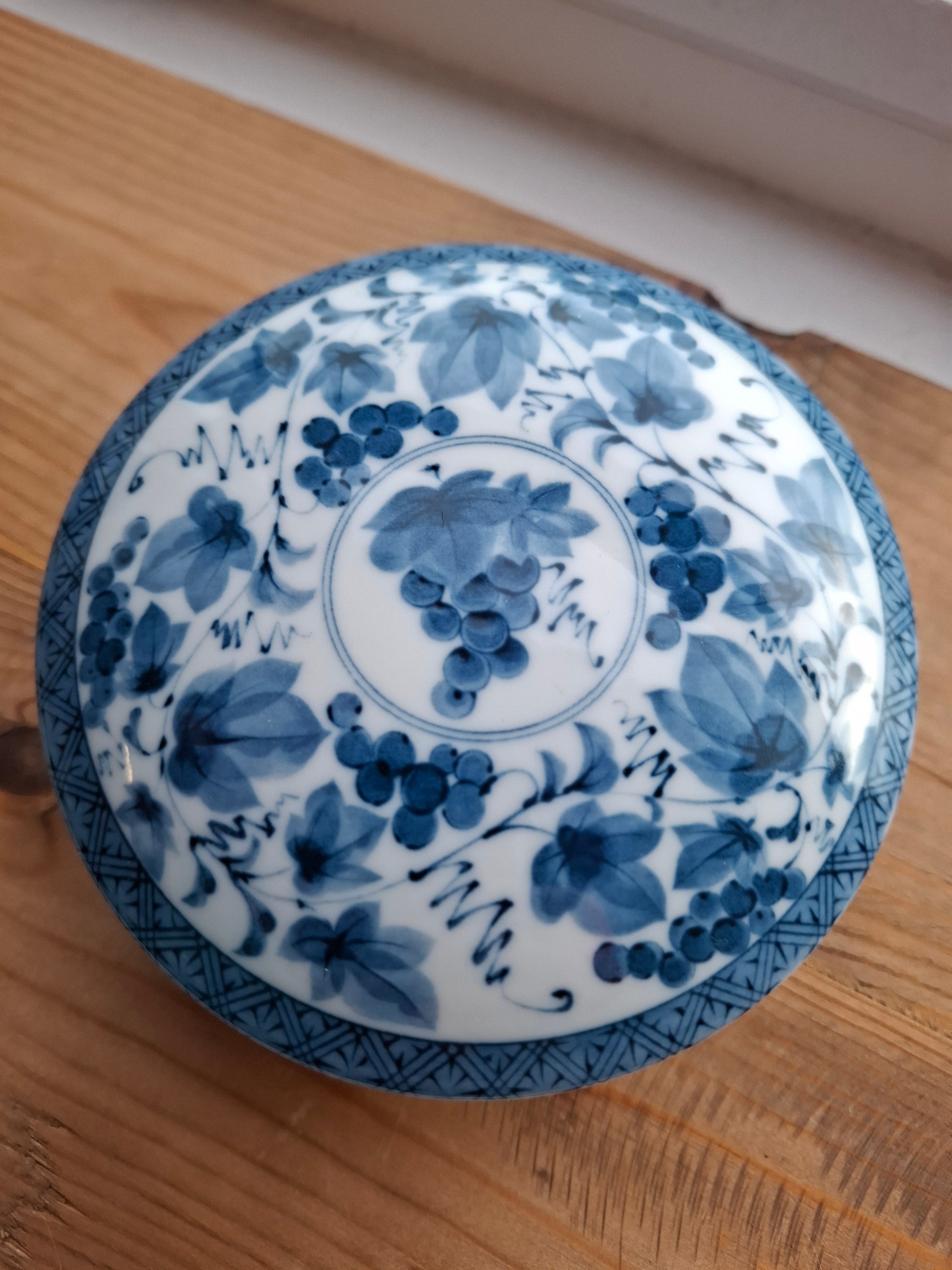 A large round blue and white trinket pot with grapes and flowers oh and beef curtains inside!