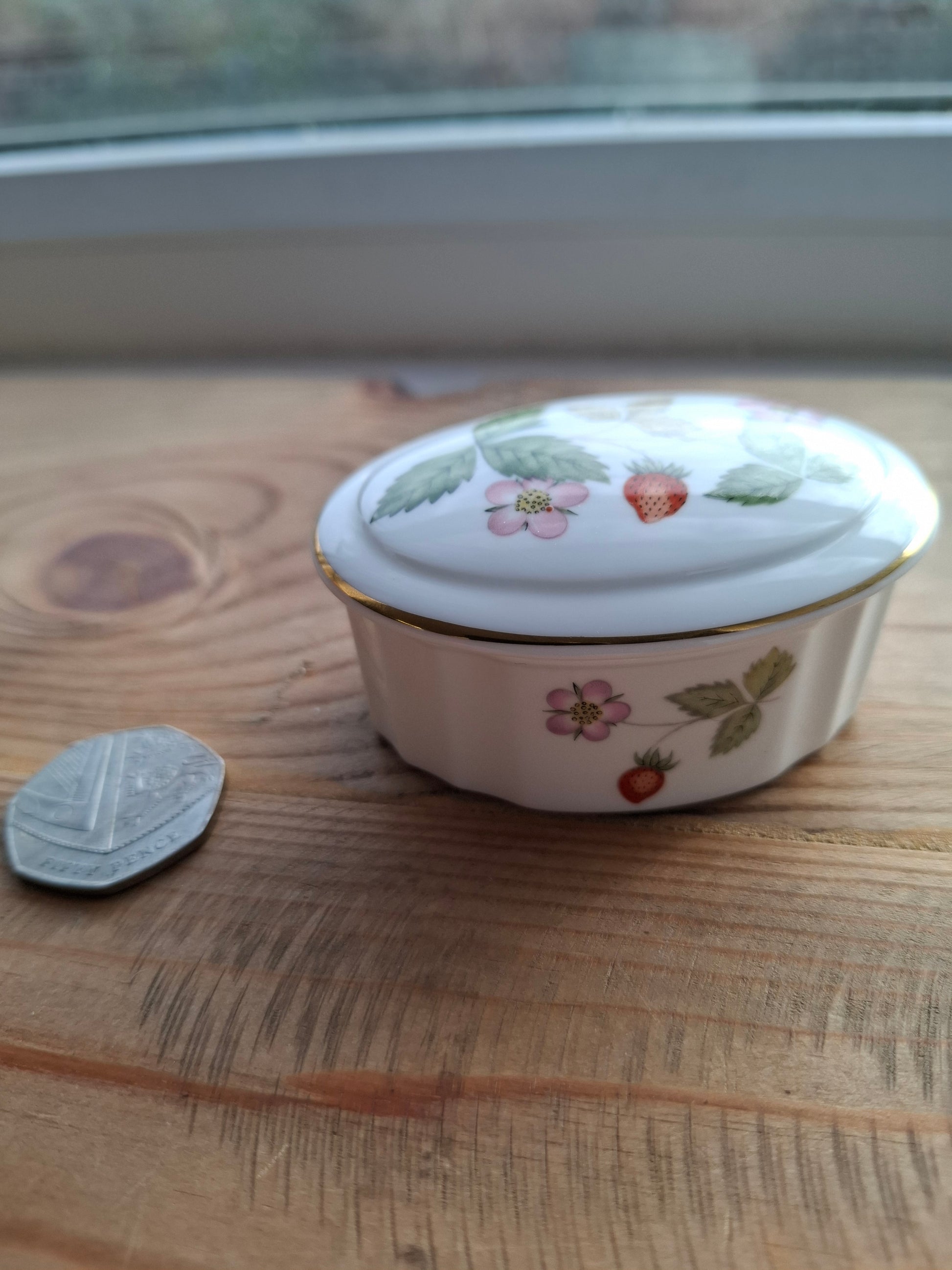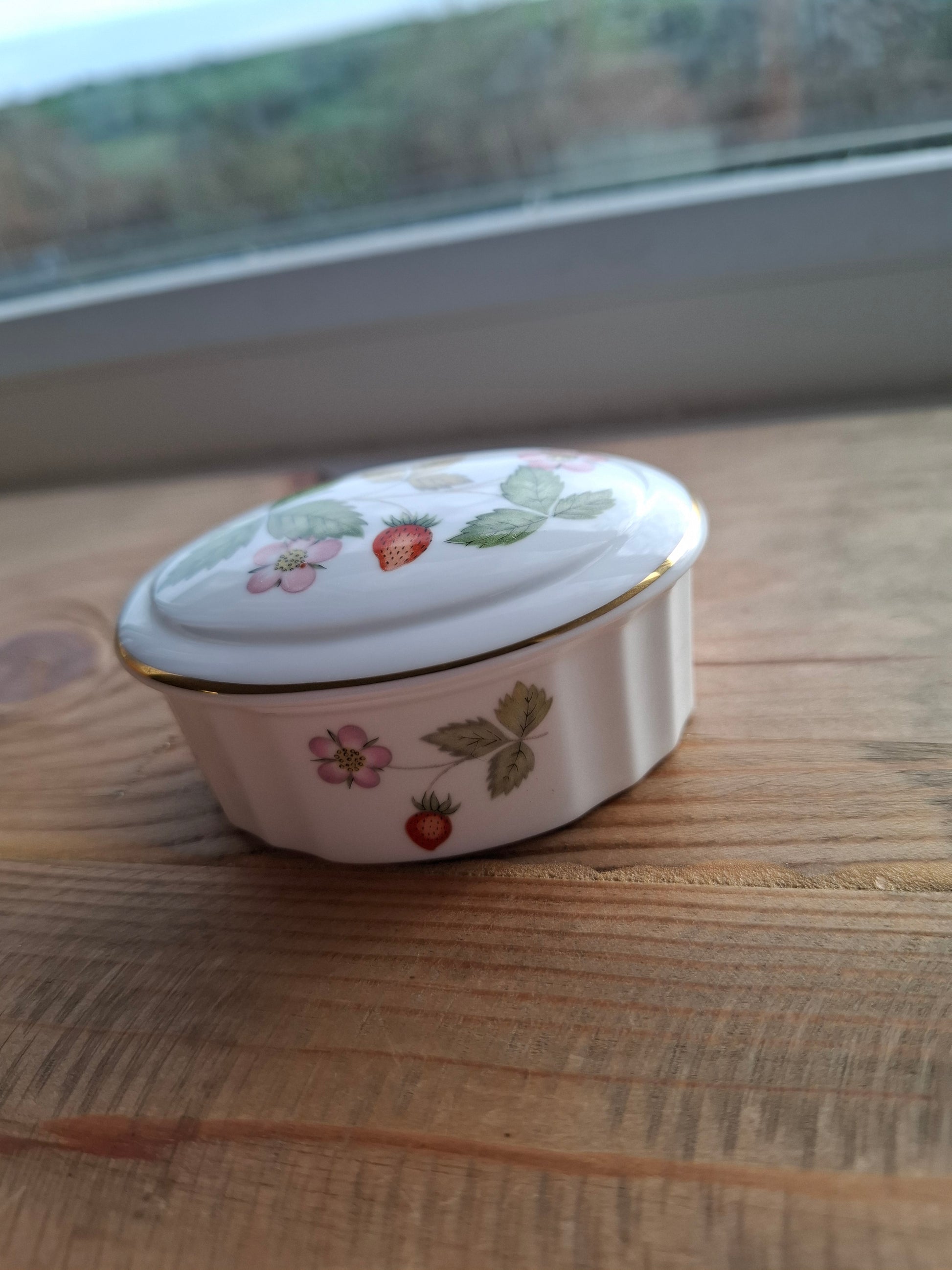 Small oval shaped trinket pot with wild strawberry pattern, inside I've added bell end!