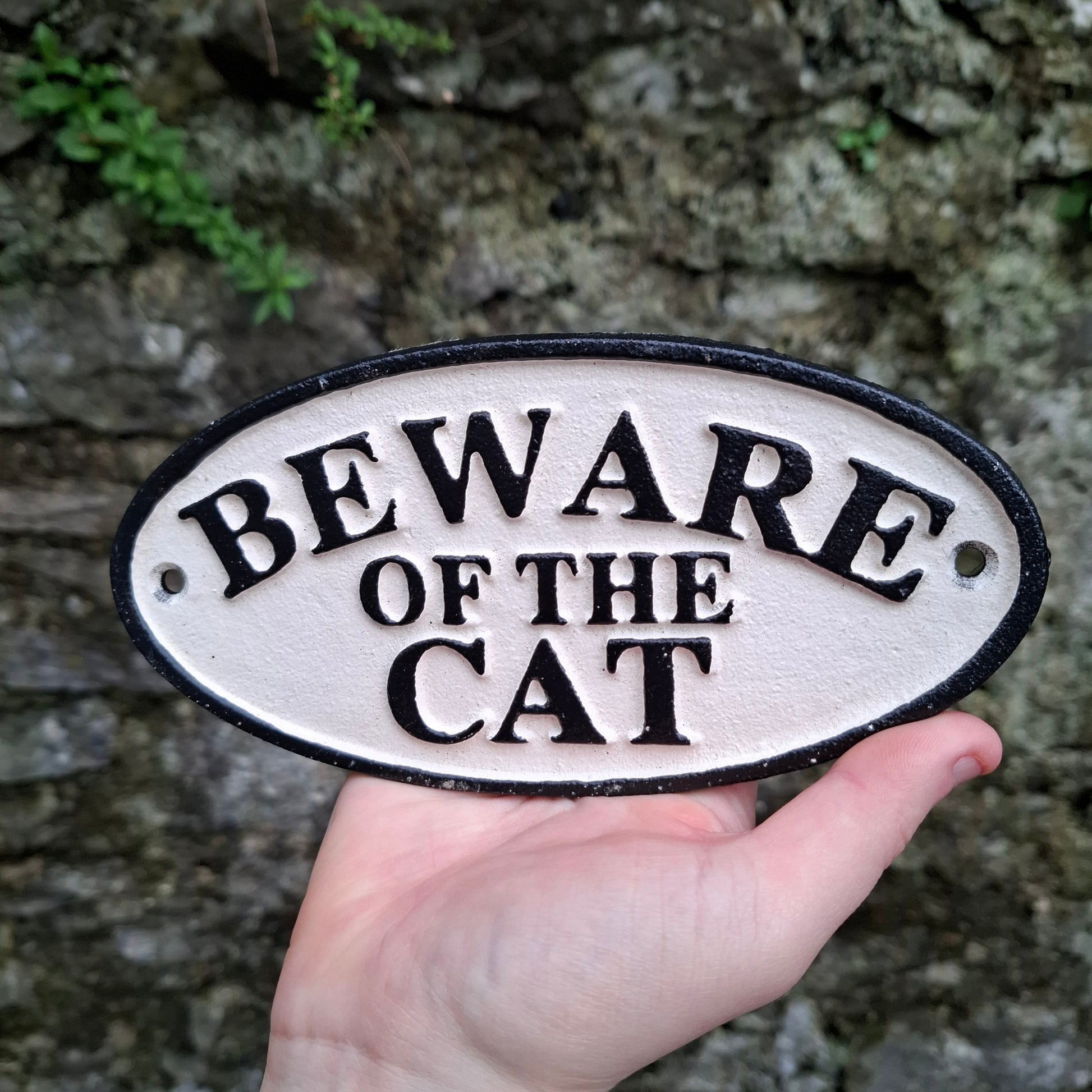 Black and white Beware of the cat outside sign, I think its cast iron. Comes without screws.