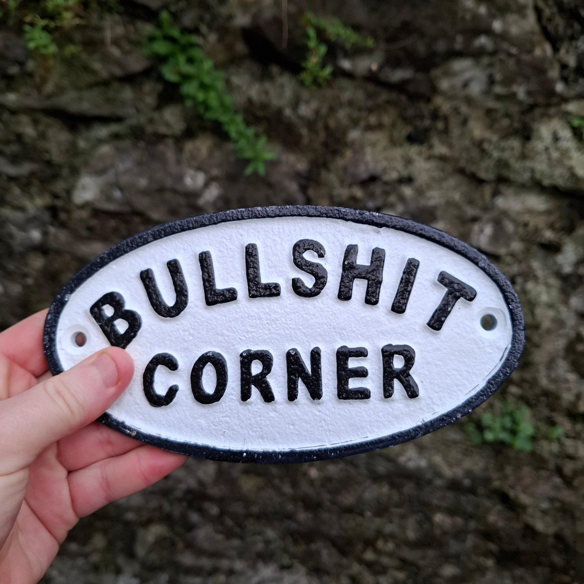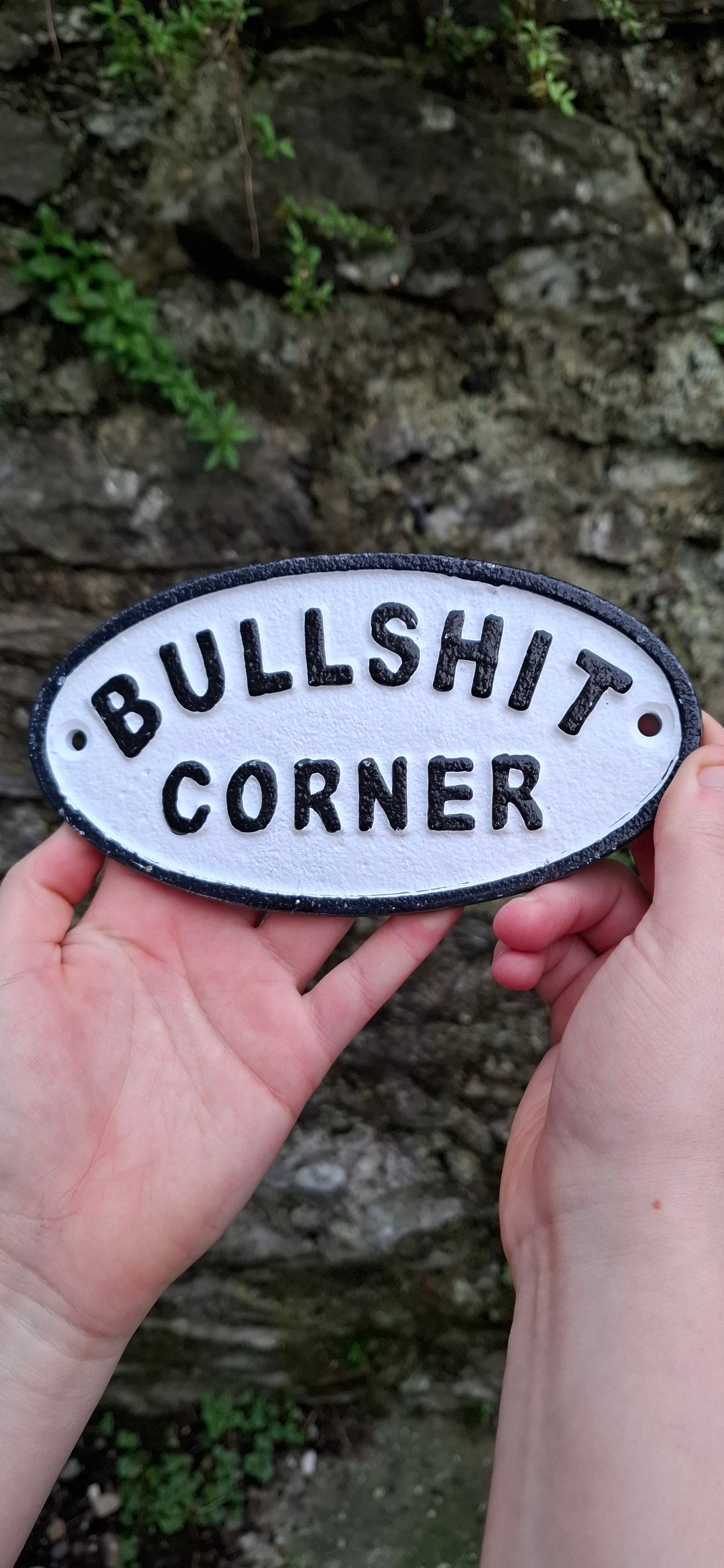 Black and white Bullshit Corner outside sign, I think its cast iron. Comes without screws.