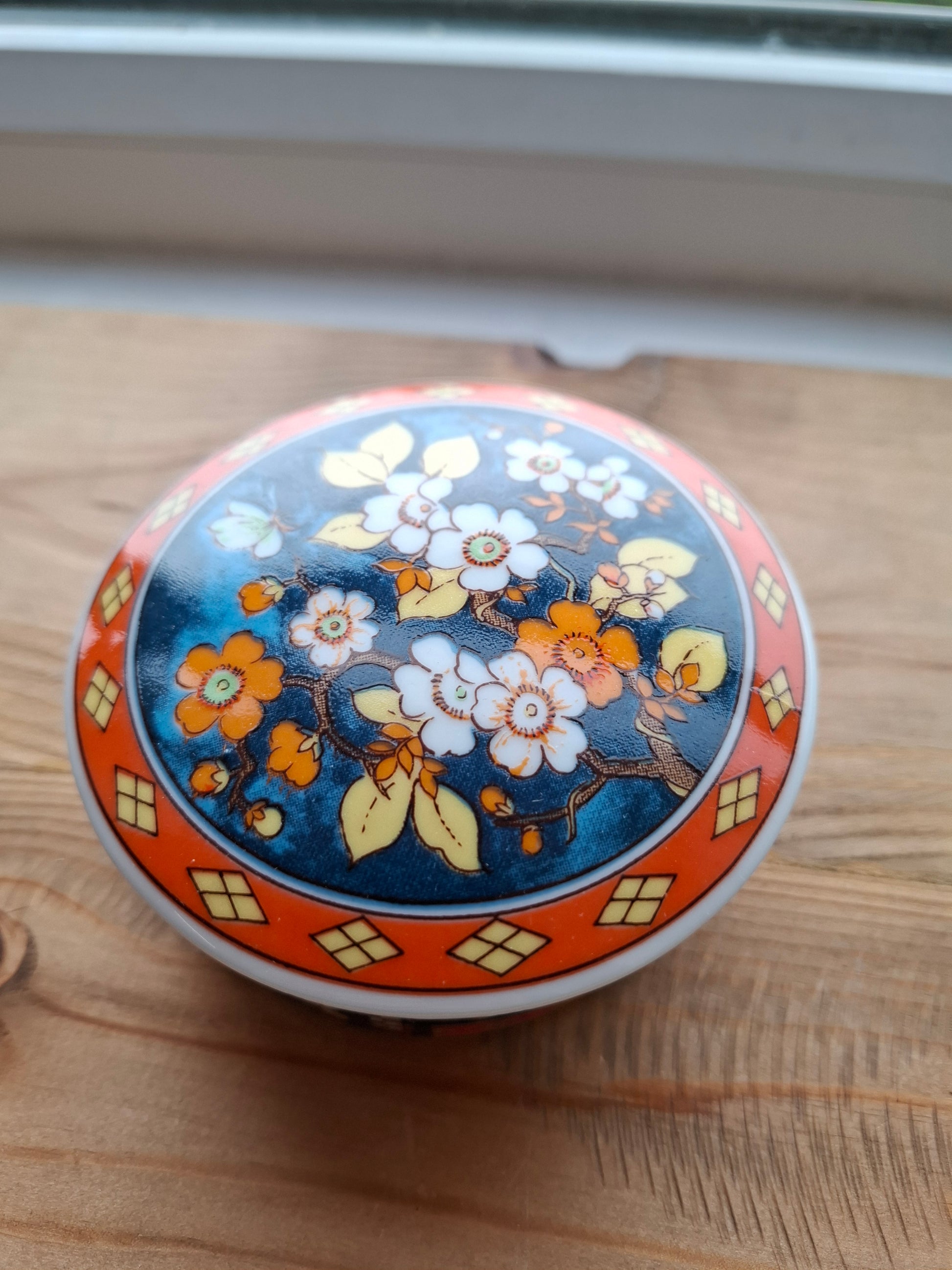 Navy blue and bright orange floral pattern in a medium sized trinket pot oh and I almost forgot, there's cunt inside!