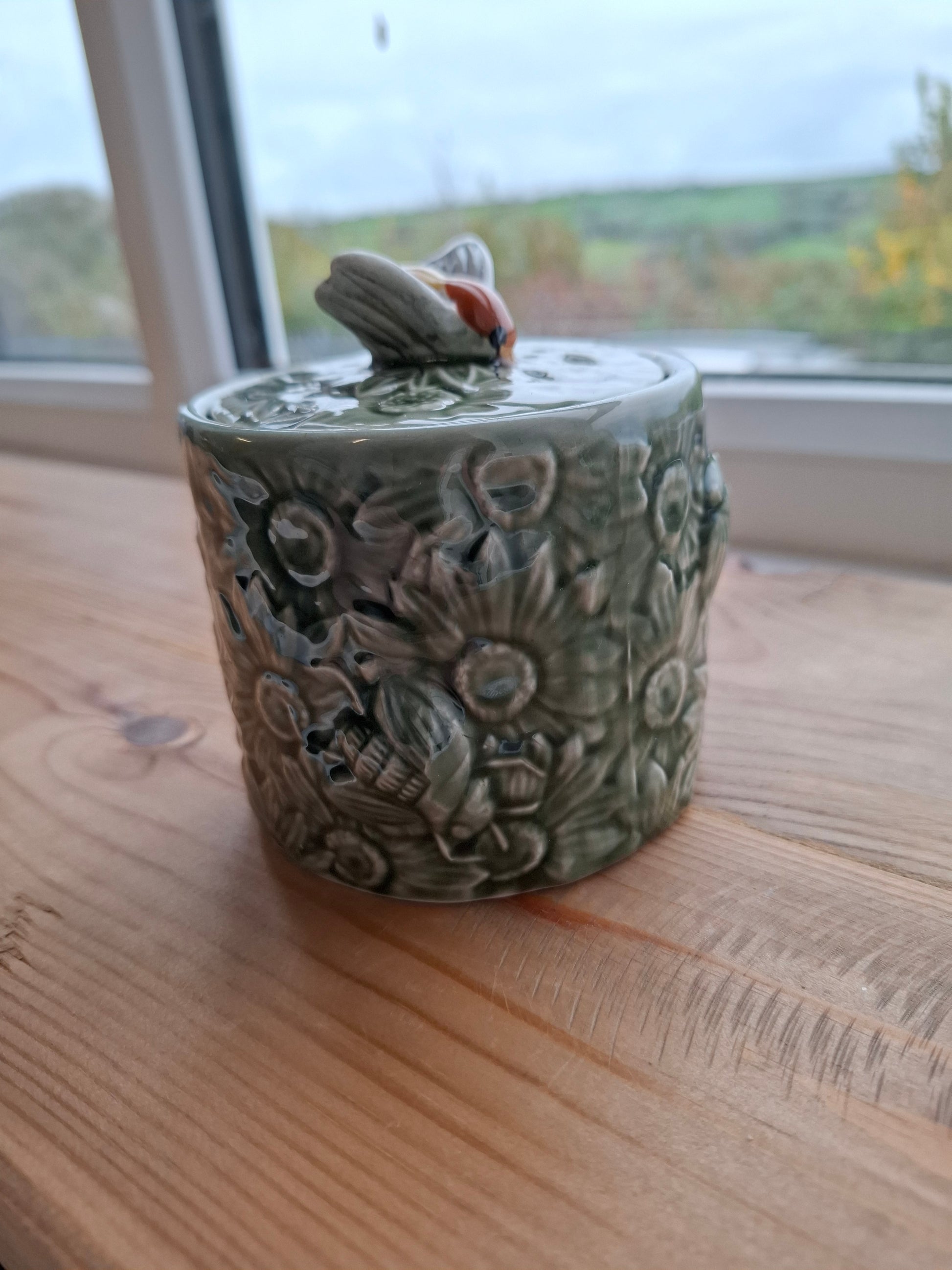 A fancy greeny ceramic pot with a very pretty pattern on the outside, a cute bee on the lid and a gold cunt inside! There are some crackles on the glaze but its not noticeable