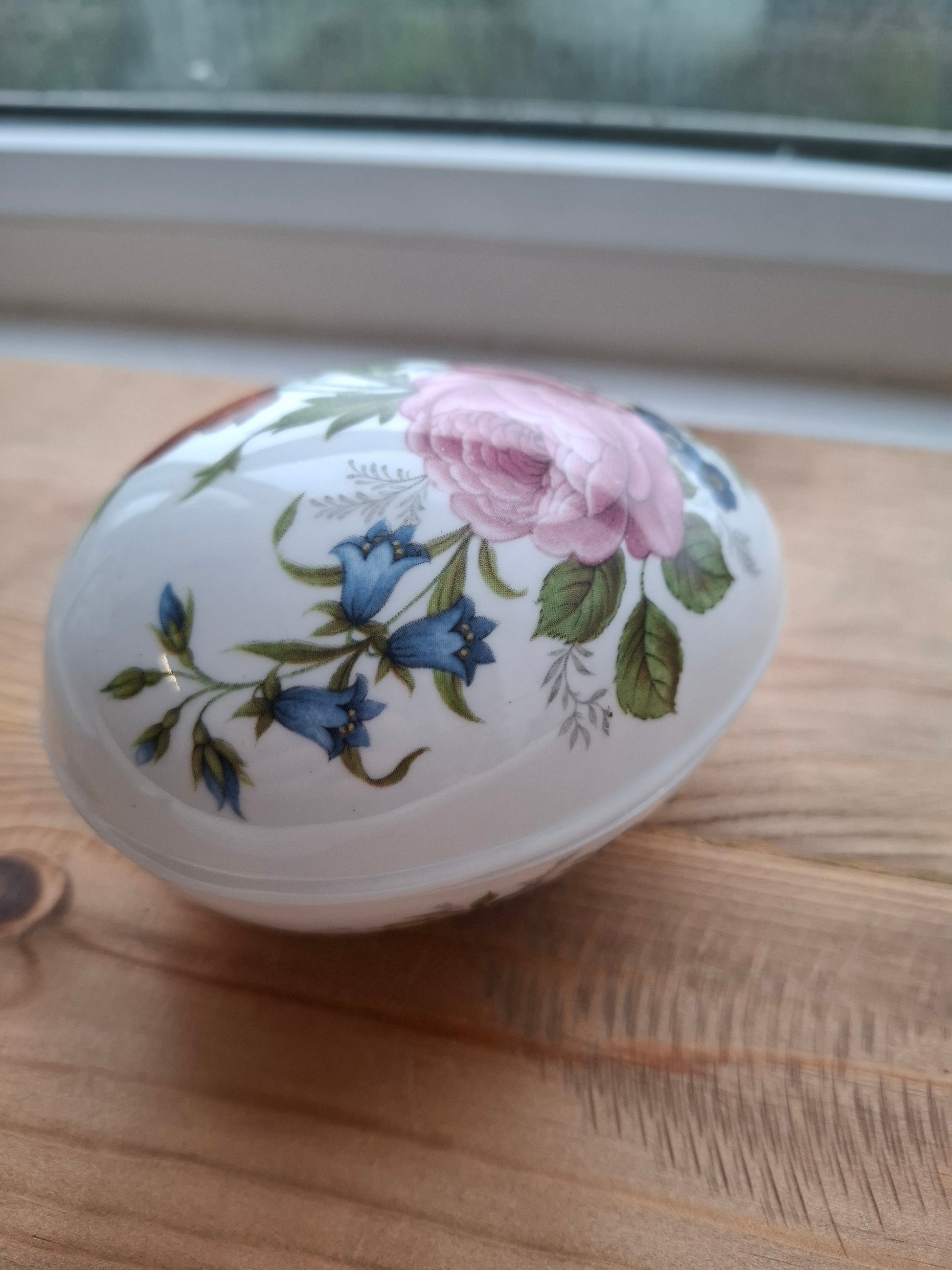 Large floral pattern egg shaped trinket pot, pink floral detail and a gold cunt inside!