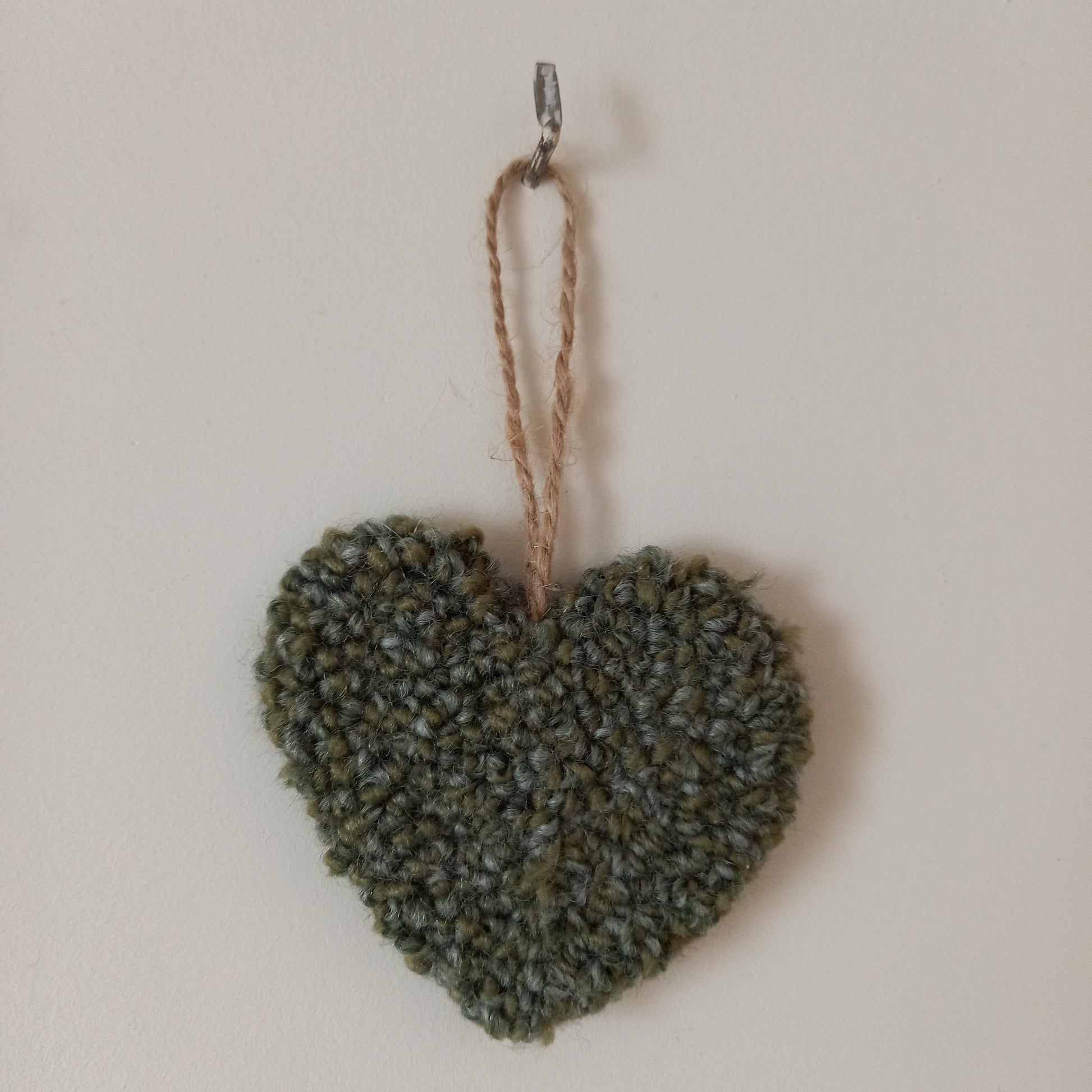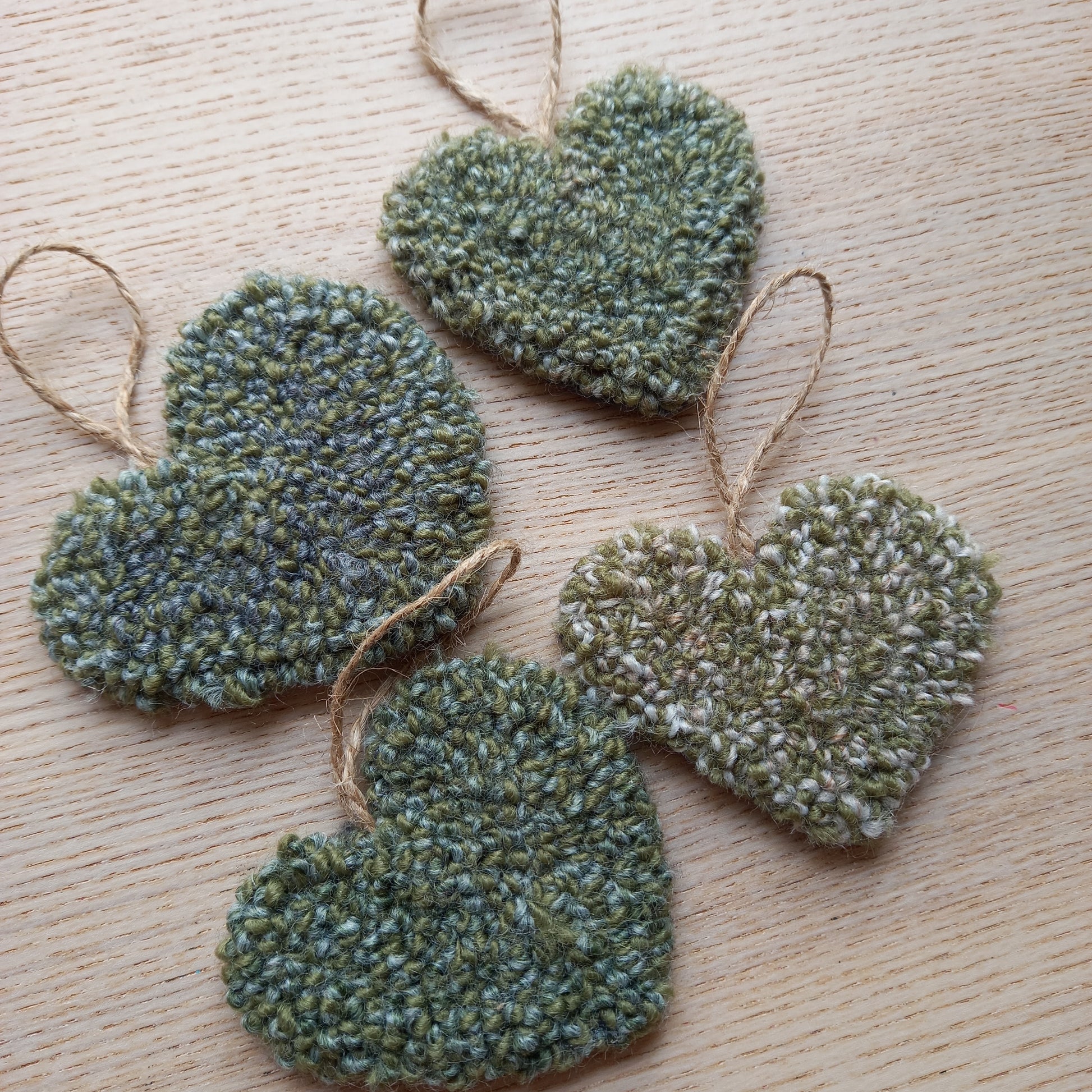 The wool I've used changes colour so the hearts are a mixture of different colours. They're made from wool/felt using a punch needle.