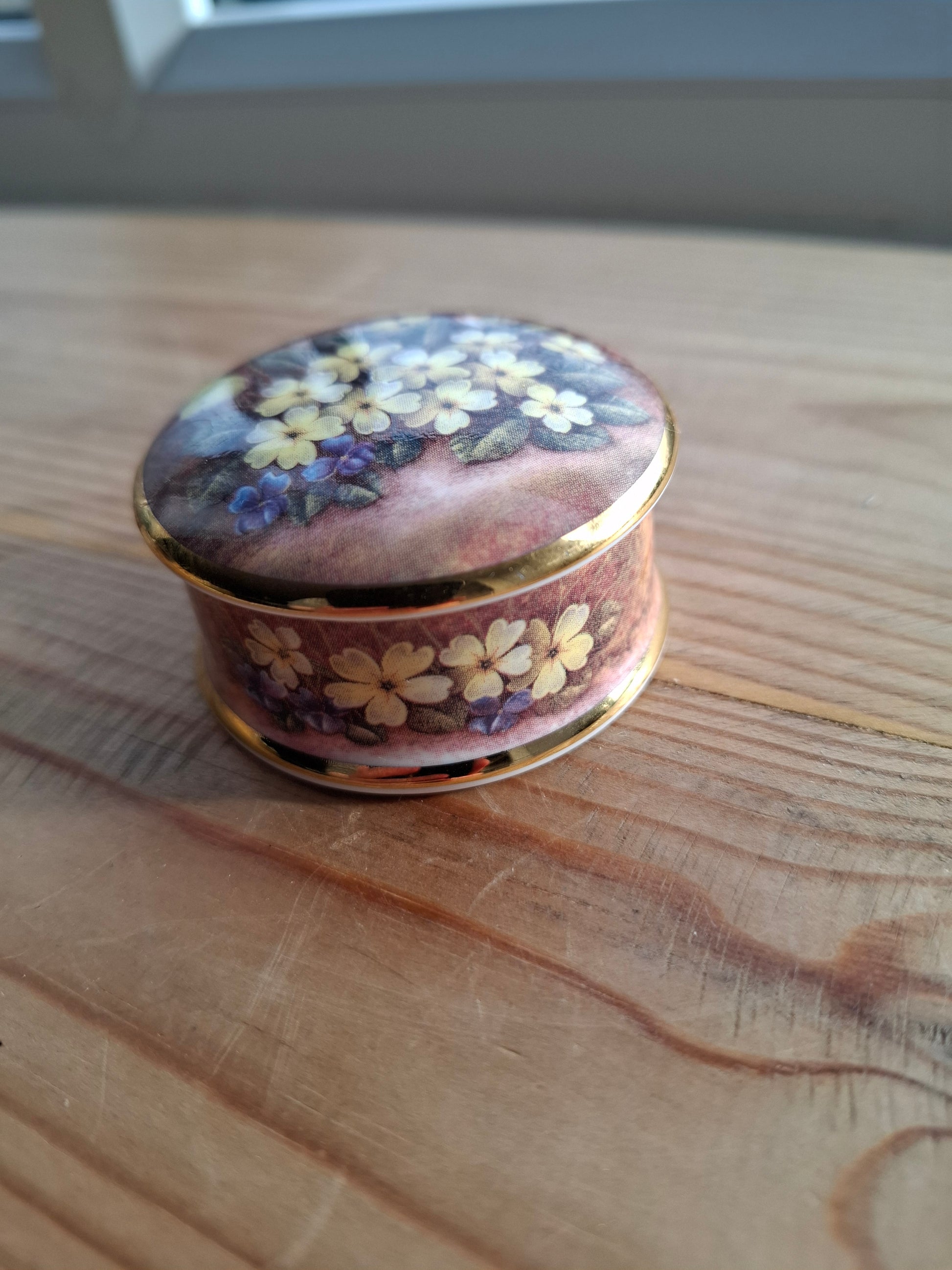 A small round trinket pot with yellow flowers and a gold rim, I've added a gold twat inside aswell!